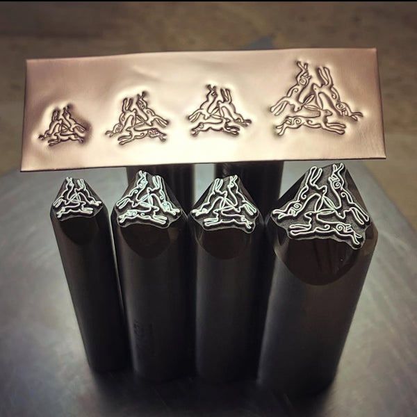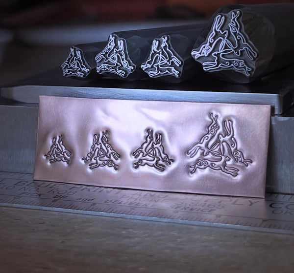 Three Hares. Three available sizes, two variations. Metal Hand Stamp.